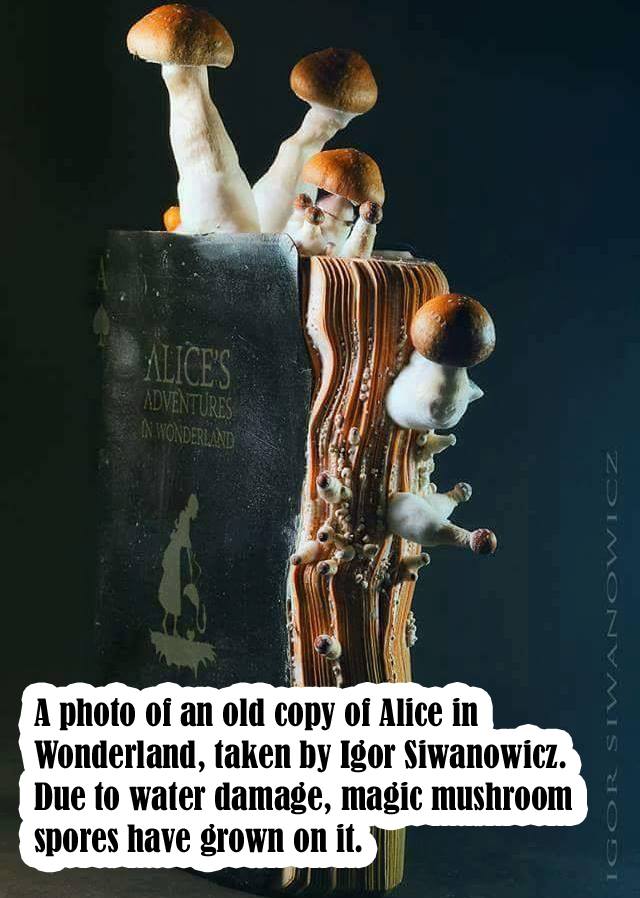 Un exemplar vechi din ”Alice în Țara Minunilor”, unde pare că povestea se revarsă, ca prin magie, în afara cărții… 🍄🍄
